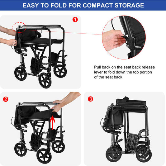 Foldable Transport Wheelchair Upgrade Steel with Hand Brakes and 8" PVC Rear Wheel